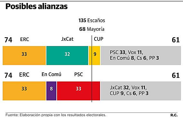 Se pueden hacer todas las sumas y restas que se quiera, pero solo hay dos opciones posibles y ambas tienen a Pere Aragonès como presidente: un tripartito secesionista, que es el que ya están negociando ERC, JxCat y la CUP, y si falla, una coalición de ERC y los comunes, con el PSC desde fuera. Esta posibilidad a día de hoy la descarta todo el mundo menos En Comú Podem. Aunque a los republicanos les servirá como elemento de presión en las negociaciones con los postconvergentes y los anticapitalistas. Y valdría como ultimísimo recurso si la negociación con Junts salta por los aires y quieren evitar nuevas elecciones como sea. Desde el propio Govern advierten de que el sistema sanitario no aguantaría otra cita con las urnas en los próximos meses. El intento de Salvador Illa por intentar la investidura no tiene apoyos y está destinado al fracaso. Los socialistas son conscientes.