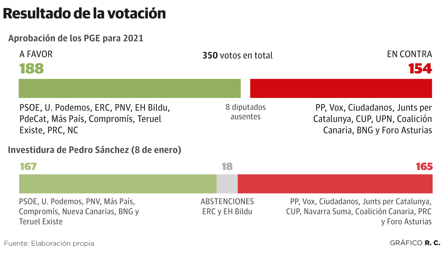 El momento más ansiado por el Gobierno de Pedro Sánchez ha llegado finalmente. El Congreso de los diputados ha dado hoy luz verde a los Presupuestos Generales del Estado para 2021 tras una larga mañana de votaciones y tres días de debate en el pleno. La coalición gubernamental de PSOE y Podemos contaba con sumar hoy 189 votos a favor y finalmente fueron 188. Es una cifra inferior a la que lograron las Cuentas en el debate de totalidad, el que abrió la puerta a su tramitación, debido al descuelgue final de los diez diputados de Ciudadanos y a un problema de última hora que hizo que ocho diputados se quedaran sin votar (uno de ellos del bloque de la mayoría), pero en todo caso supera de largo la mayoría absoluta de la Cámara.