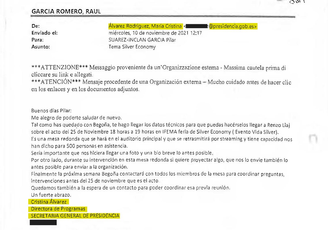 La asesora de Moncloa le hace llegar a Suárez-Inclán los «datos técnicos», para que se los haga llegar a otro directivo de Reale, sobre un acto de 'Silver Economy' (o 'economía plateada', en referencia a actividades, productos y servicios para mayores) que se iba a desarrollar el 25 de noviembre de ese mismo 2021 en el IFEMA, Feria de Madrid, con una asistencia prevista de unas 500 personas.