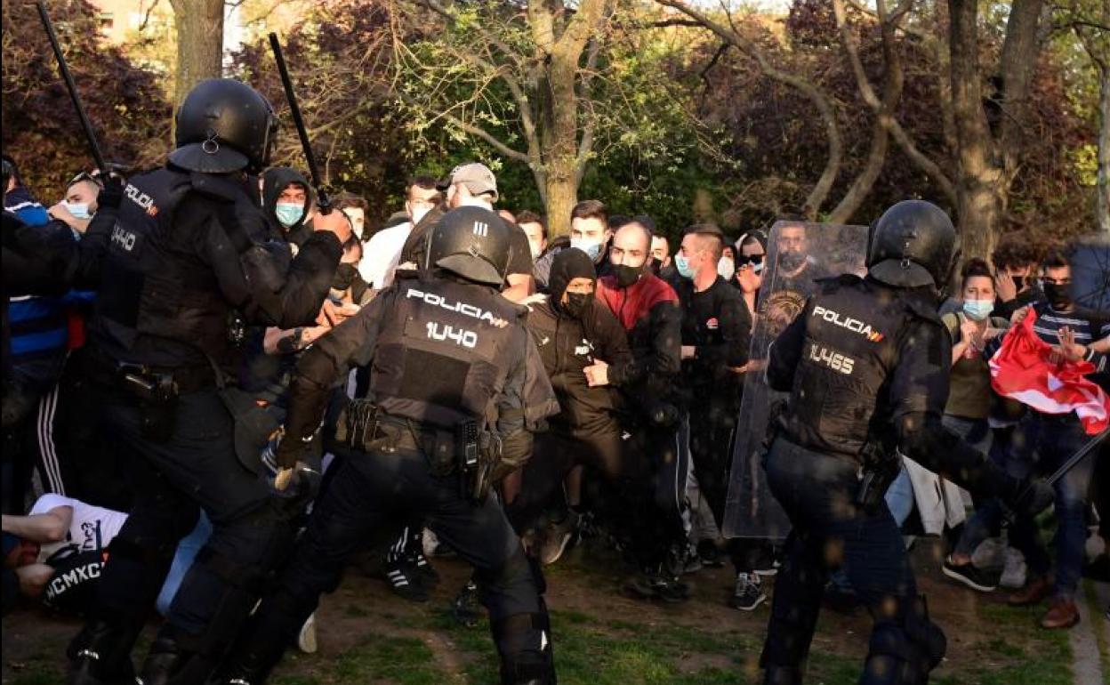 Las cargas policiales comenzaron cuando los manifestantes empezaron a arrojar objetos contra los simpatizantes de Vox tras intentar rebasar el cordón de seguridad. La intervención de los antidisturbios fue contundente y llevó a la dispersión de los congregados, que posteriormente recuperaron su posición. Al menos dos personas fueron detenidas y otras catorce resultaron heridas, entre ellas un agente de la Policía Nacional que sufrió una luxación de hombro. Entre los heridos se encuentra Ángel López, diputado de Vox por Guadalajara, y que tuvo que ser atendido en el Hospital de La Paz por una pedrada en la mano, según señaló la propia formación. Otros dos heridos también tuvieron que ser trasladados a centros hospitalarios.
