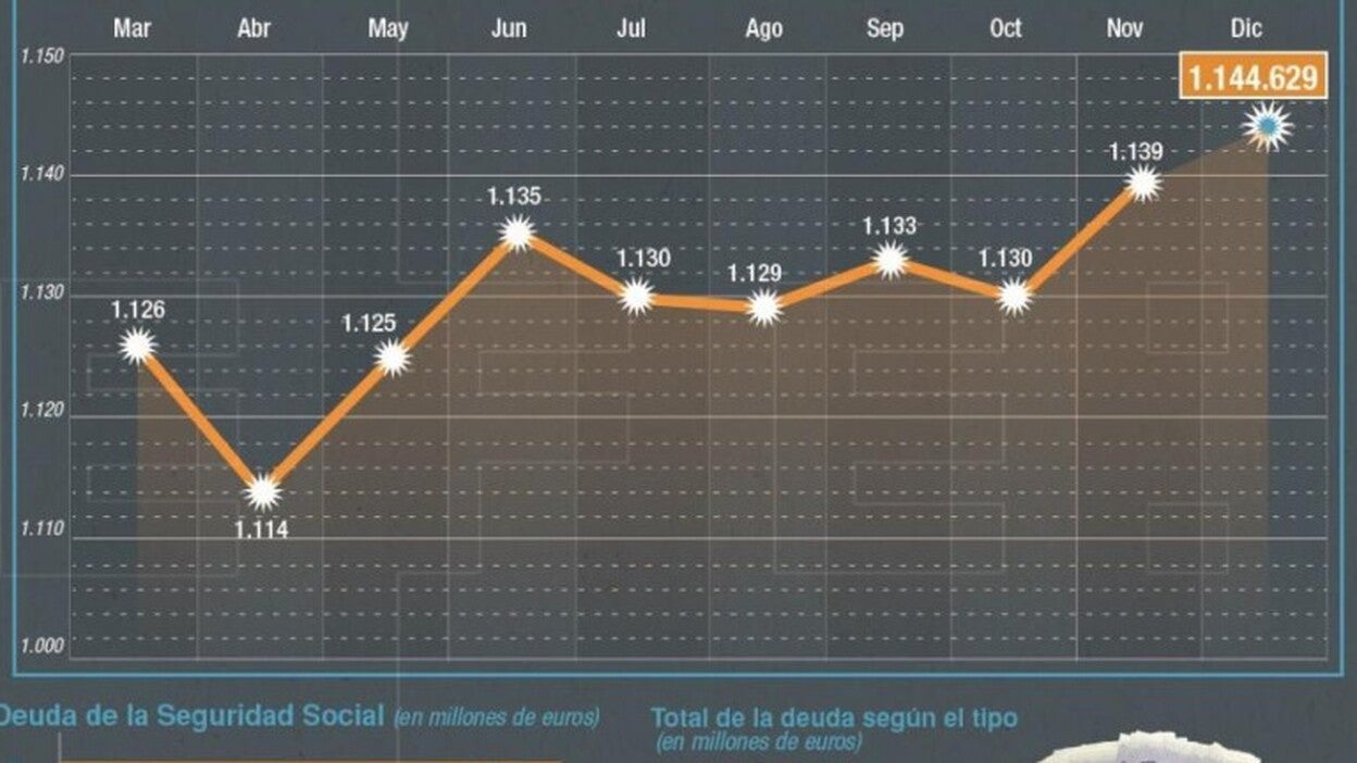 De su lado, la deuda de las administraciones de la Seguridad Social se elevó en 29 millones respecto a noviembre, hasta los 27.393 millones, lo que supone un alza mensual del 0,1% e interanual del 59,5%.