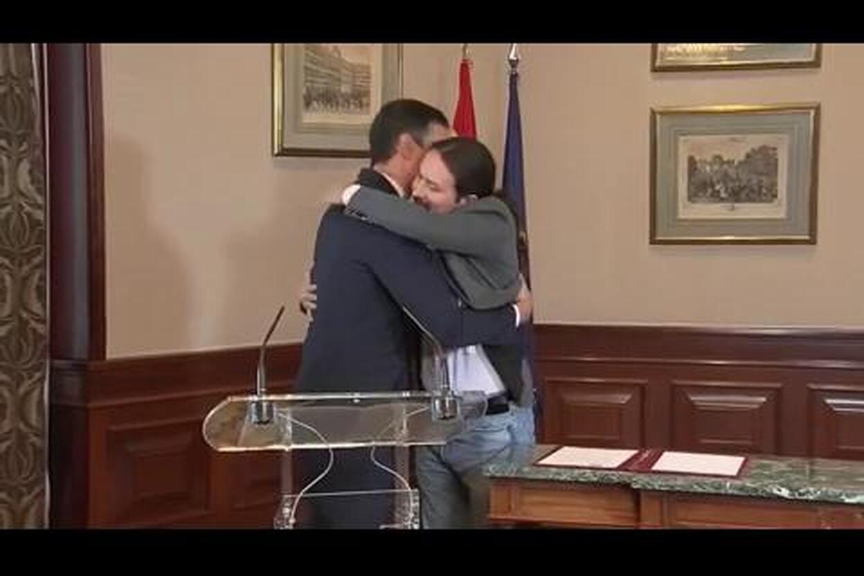 Con un caluroso abrazo, Pedro Sánchez y Pablo Iglesias han escenificado un pacto que pone fin a seis meses de desencuentros entre el PSOE y Unidas Podemos.