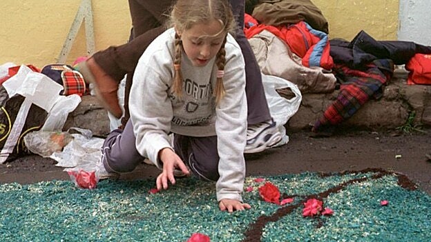 Las calles de San Mateo se llenan de serrín y flores en alfombras sobre las que pasará la Virgen de Fátima. Será un fin de semana cargado de actos mayoritariamente religiosos en los que merece la pena, sobre todo, echar un vistazo al diseño de las creaciones.