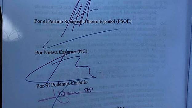PSC, NC, Podemos y ASG han firmado este sábado el documento de gobernabilidad de Canarias, con ocho ejes temáticos. Ángel Víctor Torres, presidente in pectore de Canarias, anunció que en los próximos días se anunciará el reparto de áreas.
