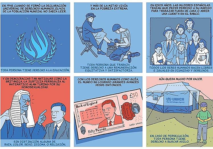 Esta segunda página comienza en la viñeta con el texto «En 1948, cuando se firmó la Declaración Universal...» y termina en la viñeta con el barco de vela latina frente a la catedral de Las Palmas y el texto «No será poco si lo hacemos todas y todos».