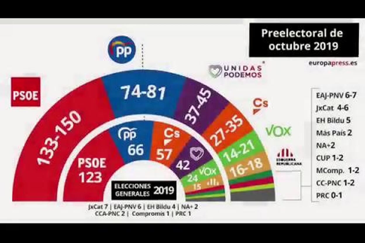 Así, da al PSOE entre 133 y 150 escaños, frente a los 123 que obtuvo en los comicios de abril, y prevé también una subida para el PP, que ahora tiene 66 escaños y que obtendría entre 74 y 81 diputados, lejos aún del centenar que sí le auguran otras encuestas.