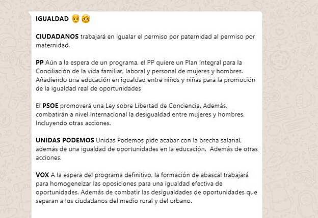 Según un estudio de SIGMA DOS, el 75% de los españoles piensa que el programa electoral es un contrato entre los partidos políticos y la ciudadanía, pero solo el 38% de ellos lo leen antes de emitir su voto. Por ello, un asistente virtual permite comparar las posiciones de PP, PSOE, Ciudadanos, Unidas Podemos y VOX sobre más de 25 temas, usando la voz o escribiendo en WhastApp.