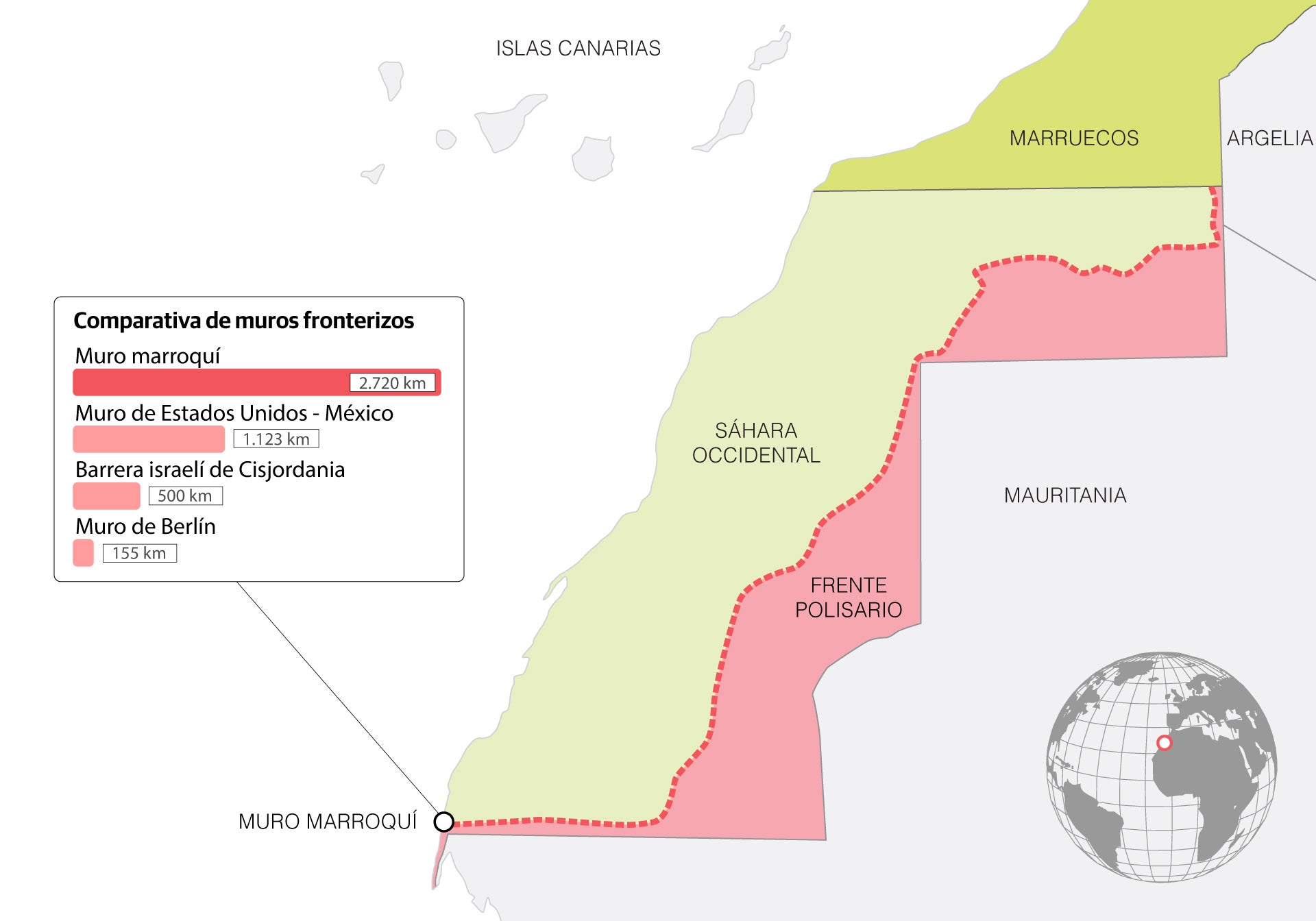 El muro que divide en dos el Sáhara Occidental mide 2.700 kilómetros, es el muro militar más grande del mundo. Fue contruido en los años 80 para separar las zonas ocupadas por Marruecos y los terrenos del Frente Polisario