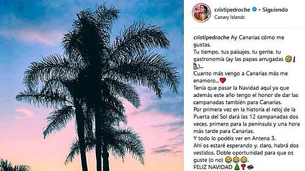«Ay Canarias cómo me gustas. Tu tiempo, tus paisajes, tu gente, tu gastronomía (ay las papas arrugadas)...Cuanto más vengo a Canarias más me enamoro...», ha escrito Pedroche, recordando que «tenía que pasar la Navidad aquí ya que además este año tengo el honor de dar las campanadas también para Canarias. Por primera vez en la historia el reloj de la Puerta del Sol dará las 12 campanadas dos veces, primero para la península y una hora más tarde para Canarias».