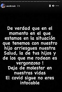 Un enfado que no ha parado de crecer en las últimas horas. Ella considera que el padre de su hijo se ha relajado con las vacaciones y que podría haber evitado el hecho de haber contraído el virus, una versión que dista mucho de la dada por el jugador de fútbol. «De verdad que en el momento en el que estamos, en la situación que tenemos con nuestro hijo que arriesgues nuestra salud, la de tus hijos y de los que me rodean es vergonzoso. Dejar de molestar en nuestras vidas…El covid sigue, no eres intocable», ha escrito Aurah Ruiz en sus stories. Él, por su parte, ha emitido un comunicado en el que deja claro «que nadie está a salvo de este virus» y que no ha expuesto a nadie siendo consciente de ello. Tanto es así que incluso amenaza con medidas legales a quien lo ponga en duda.