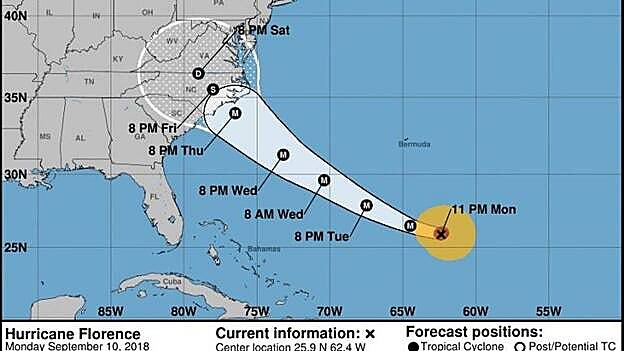 Según un probable patrón de trayectoria, el vórtice de Florence se moverá por el suroeste del Atlántico entre Bermudas y las Bahamas hasta mañana, miércoles, y se acercará a la costa de Carolina del Norte o Carolina del Sur el viernes.