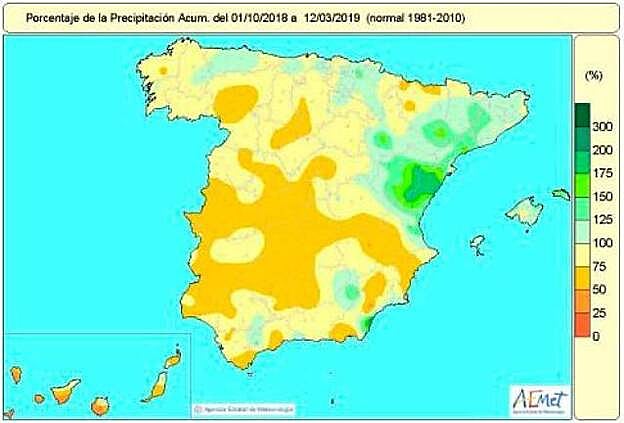 Las lluvias acumuladas en el conjunto de España en lo que va de año hidrológico, que comenzó el 1 de octubre de 2018 hasta el 12 de marzo se sitúan en 319 litros por metro cuadrado, lo que supone un 14% del valor normal para este periodo, que son 372 litros por metro cuadrado, según la Agencia Estatal de Meteorología (AEMET).