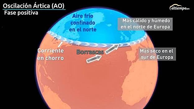 Cuando el índice de la oscilación ártica es positivo y ese aire queda confinado en el polo esta corriente en chorro es intensa y las borrascas afectan al norte del continente europeo, algo que propicia tiempo más cálido y húmedo al norte de Europa y más seco al sur, de ahí la escasez de precipitaciones en el sur de Europa y este ambiente primaveral.