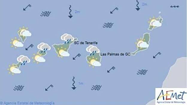 En el norte y nordeste, nuboso o cubierto con probabilidad de lluvias débiles y ocasionales, principalmente a primeras y últimas horas del día. En el resto, poco nuboso tendiendo a intervalos nubosos por la tarde. Temperaturas con pocos cambios. Viento del nordeste, con intervalos de fuerte en la vertiente sureste, extremo noroeste y cumbres. Predominio de las brisas en la costa suroeste.