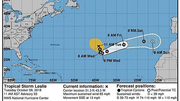 Según informa La Agencia Estatal de Meteorología (Aemet) sobre la tormenta tropical Leslie y su influencia en Canarias, la última estimación sigue situando su centro al norte de Canarias entre los paralelos 30 y 35.