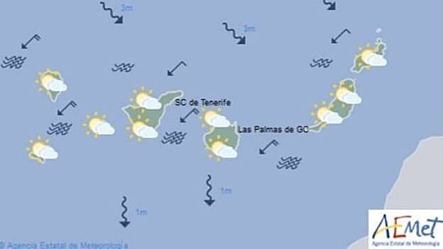 La entrada de un frente roto y débil desde el NW traerá cielos nubosos con intervalos de lluvias débiles en las islas de mayor relieve, primero en La Palma, comenzando esta noche, y posteriormente en el resto, principalmente en la primera mitad del día, según la predicción de la Agencia Estatal de Meteorología.