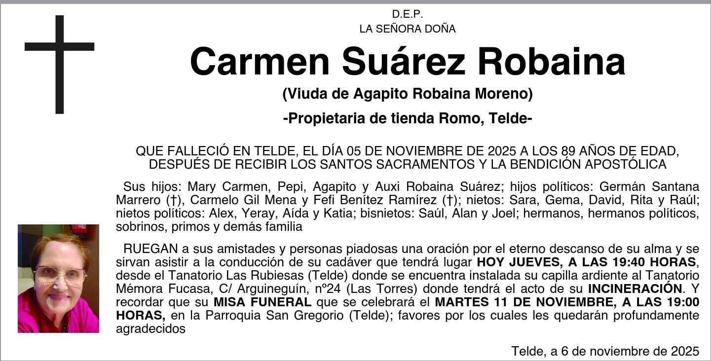 RUEGAN a sus amistades y personas piadosas una oración por el eterno descanso de su alma y se sirvan asistir a la conducción de su cadáver que tendrá lugar HOY JUEVES, A LAS 19:40 HORAS, desde el Tanatorio Las Rubiesas (Telde) donde se encuentra instalada su capilla ardiente al Tanatorio Mémora Fucasa, C/ Arguineguín, nº24 (Las Torres) donde tendrá el acto de su INCINERACIÓN. Y recordar que su MISA FUNERAL que se celebrará el MARTES 11 DE NOVIEMBRE, A LAS 19:00 HORAS, en la Parroquia San Gregorio (Telde); favores por los cuales les quedarán profundamente agradecidos