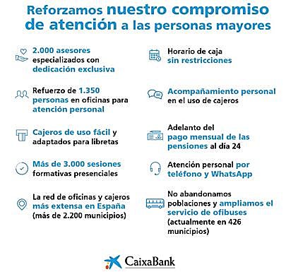 CaixaBank va a potenciar la atención personal a las personas mayores. Hoy ha anunciado que reafirma su compromiso con el colectivo sénior con la puesta en práctica de una decena de iniciativas, entre las que destacan la creación de un equipo de 2.000 consejeros sénior, la ampliación del horario de caja en oficinas y el refuerzo de todos sus canales de comunicación con estos usuarios.