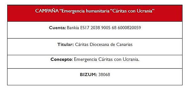 Cáritas Diocesana de Canarias sigue contribuyendo a este esfuerzo conjunto y fraterno de Cáritas Española y ha aportado 10.000€ de sus fondos propios a la campaña «Cáritas Con Ucrania». Las necesidades crecen a diario, e invitamos a todas las comunidades, empresas colaboradoras y personas a contribuir con sus donativos en la cuenta: