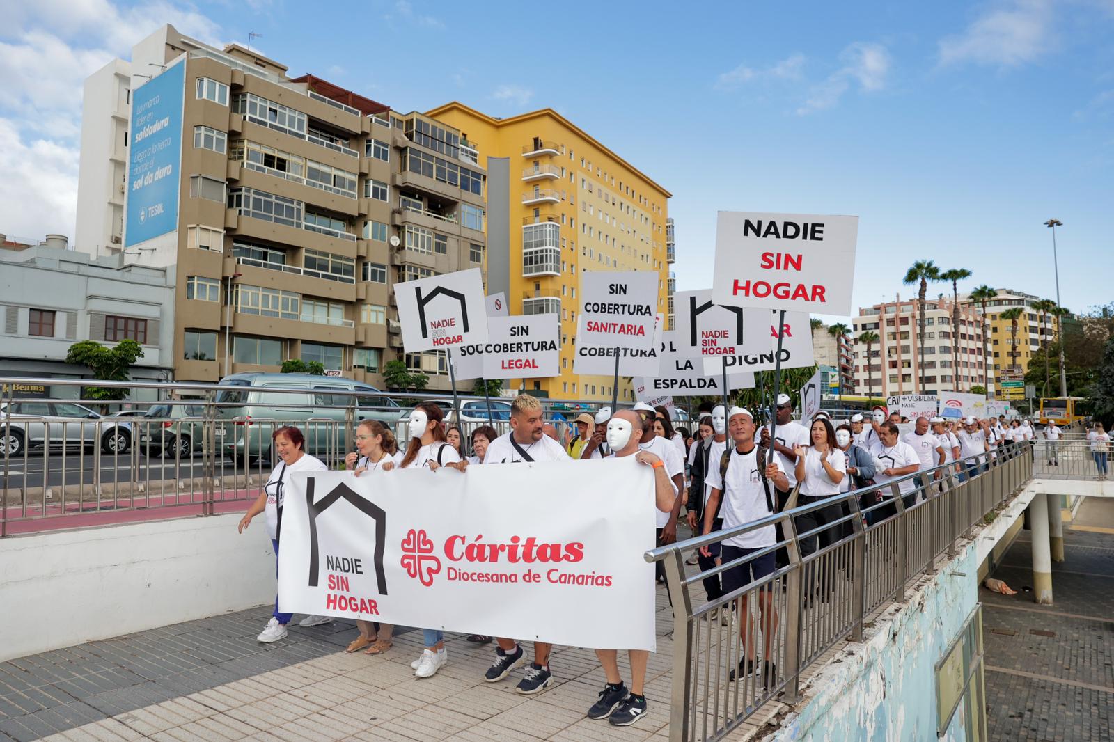Bajo el lema 'Comparte tu red. No dejes que se queden fuera de cobertura', personal y usuarios de Cáritas recorrieron esta este lunes el trayecto entre Las Alcaravaneras y Mesa y López para visibilizar la situación de las personas en situación de sin hogar. «Cuando no hay vivienda se vulnera el derecho al agua, a la higiene, a la seguridad, a la alimentación, al uso de tecnologías, a tener una dirección para las gestiones. También a la salud física y mental», señala la institución en el manifiesto con el que reivindica el Día de las Personas sin Hogar, que se conmemora el próximo 29 de octubre.
