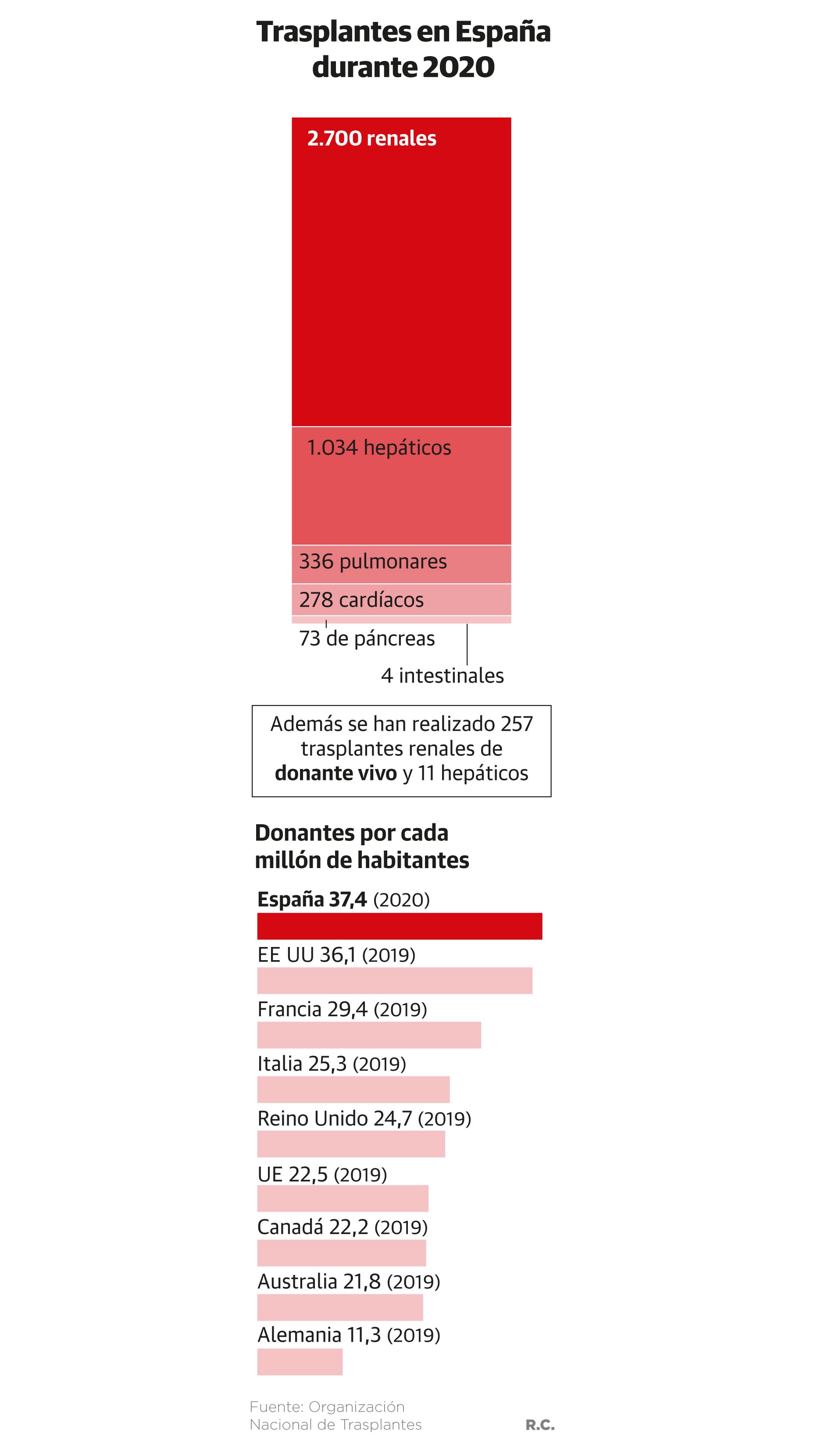 La recesión de actividad sucede después que en 2019 se llegara al récord de 49 donantes por millón de habitantes, con tres meses de parálisis que requirió una «reconstrucción» del sistema. «Se dieron pautas claras a los centros para evaluar tanto a los receptores como a los donantes con respecto a la infección. Al principio no era nada sencillo hacer las PCR, ahora sí. Si da positivo se retrasa el trasplante», prosigue Domínguez-Gil. «Después tuvimos que saber cómo actuaba la infección en el paciente trasplantado e inmunosuprimido. Había miedo en la primera ola. No se sabía su impacto. Ahora podemos decir que no hay sospechas de infección de un donante al receptor. También tuvimos que cambiar la gestión y priorizar a los donantes más idóneos en cuanto a edad y número de órganos potencialmente trasplantable».