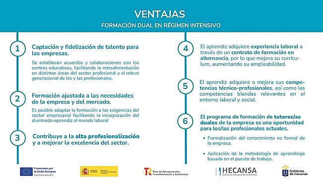 En la FP Dual en Régimen Intensivo el aprendiz se convierte en trabajador a partir de los tres meses de comenzar la formación teórica, ya que dedican hasta un 50% de sus horas lectivas al aprendizaje en un entorno real de trabajo. Se insertan en el mercado laboral desde el comienzo de su itinerario y perciben remuneración económica gracias a un contrato de formación en alternancia. La diferencia es notable con la FP Dual en Régimen General, que solo contempla, dentro de una empresa, un máximo del 35% de las horas cursadas. A cambio, las compañías que acogen a los aprendices amplían y complementan los contenidos formativos para satisfacer las necesidades actuales del mercado turístico canario. La simbiosis es perfecta para quienes busquen titulaciones con alta empleabilidad. Y las ventajas para el empresariado no son menores, puesto que logran captar el talento de los aprendices desde el principio de su formación y promover el sentimiento de pertenencia a la empresa.