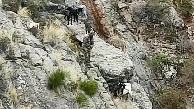 En las imágenes, que circulan por mensajería instantánea y redes sociales, muestra el momento en el que una persona con ropas de camuflaje similar a la que suelen utilizar los cazadores, intenta capturar supuestamente una de las cabras asilvestradas o abandonadas en las medianías y cumbre de Gran Canaria y esta termina rodando por la ladera por la presión y las mordidas de una jauría de cinco perros.