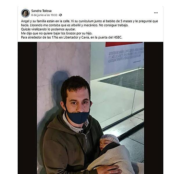 Una mujer que pasó por la puerta del banco, llamada Sandra Tolosa, vio el cuadro de situación de la familia, le sacó una foto a Ángel, que posaba con lágrimas en los ojos junto a su bebé Bastián en sus brazos, y decidió contar su historia en la red de Facebook.