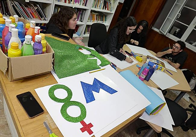 Las asociaciones feministas de Gran Canaria ya tienen todo preparado para hacerse oír en la manifestación de esta tarde. En las imágenes de la derecha, jóvenes del colectivo Gamá de Lesbianas, Gays, Trans y Bisexuales de Canarias dan los últimos retoques a los carteles y pancartas con los que intentarán remover conciencias. La marcha, bajo el lema 'Juntas, más fuertes, más lejos', partirá a las 19.00 horas del parque de San Telmo, en la capital grancanaria, para recorrer las calles hasta la plaza de Santa Ana.