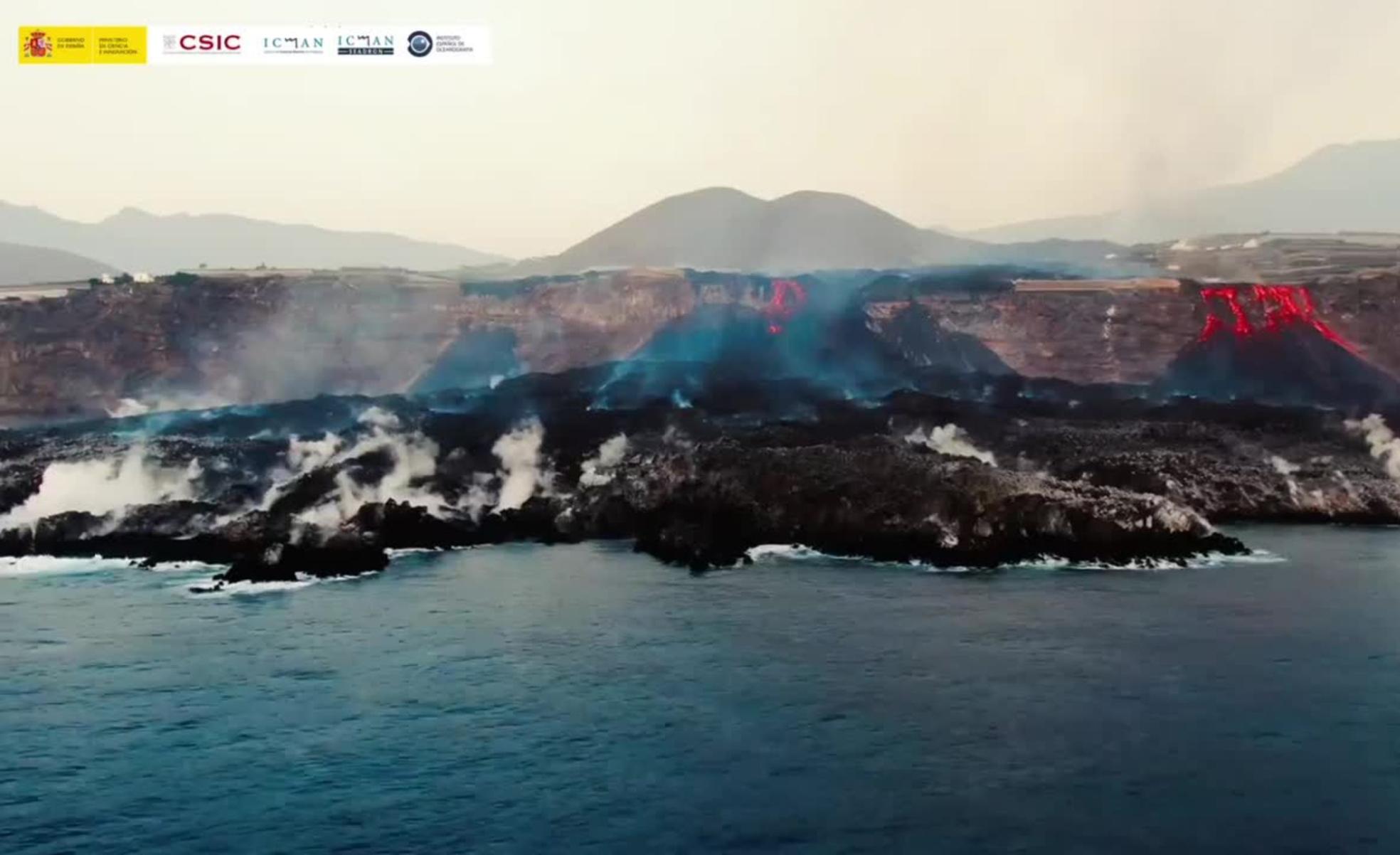 Las fotografías captadas por científicos del Instituto de ICMAN-CSIC permiten observar el avance de la lava del volcán hacia el mar y el impacto geográfico que está produciendo en la zona