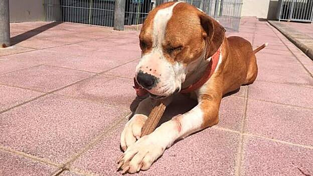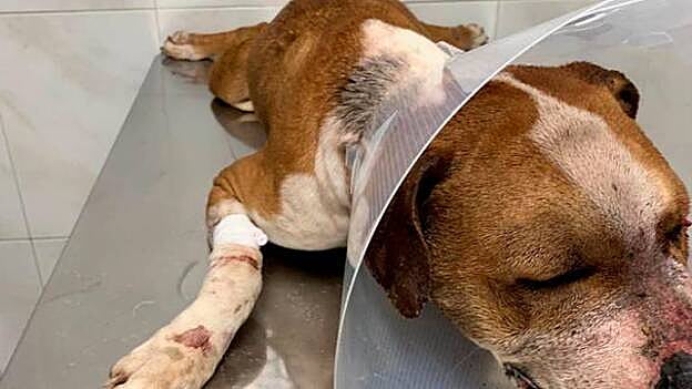 La Policía Local ya ha identificado al dueño El animal presentaba síntomas evidentes de maltrato con el hocico hinchado y sangre en la cara tras ser encontrado en un contenedor de basura en Costa Ayala.