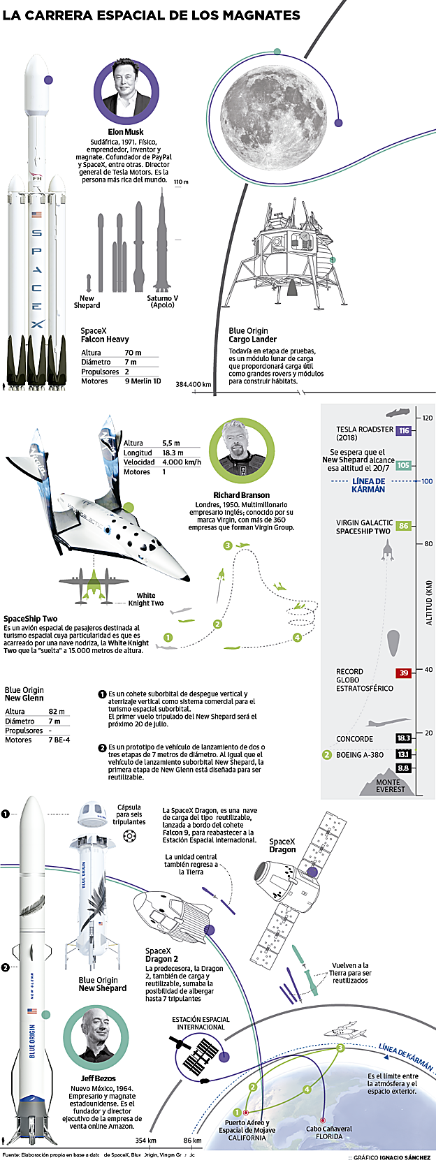 «El azar ha querido que los dos principales impulsores del turismo espacial tengan sus naves operativas al mismo tiempo». Así resume el astrofísico y divulgador científico Daniel Marín este julio en el que dos milmillonarios han decidido montarse en sus propias naves para convertirse en astronautas. El inglés Richard Branson, fundador del Grupo Virgin, flotó hace una semana durante 4 minutos a 86 kilómetros de altura. Jeff Bezos, dueño de Amazon y el hombre más rico del mundo, quiere hacerlo el martes a los 105. El tercero en discordia, Elon Musk, propietario de Tesla, pretende mandar al multimillonario japonés Yusaku Maezawa en un viaje alrededor de la Luna en 2023, aunque no parece que su compañía SpaceX vaya a centrarse en el turismo espacial.
