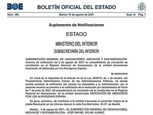 Tras iniciar el pasado 7 de junio un procedimiento de inscripción en el Registro Nacional de Asociaciones a la Asociación de Abducidos por los Alienígenas España, el Ministerio de Interior, tal y como publica en el BOE de este martes 10 de agosto, ha desestimado finalmente la solicitud. Lo ha hecho «por causas no imputables a la Administración», al no poder notificársela a ninguna persona de la organización.