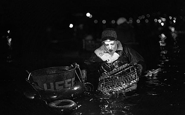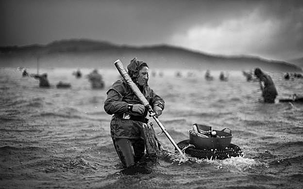 Marisol, mariscando berberecho en la ría de Noia durante un temporal. Marisol es la presidenta de las mariscadoras de la cofradía de Noia.