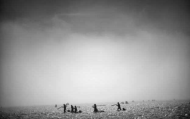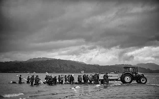 Las mariscadoras de la cofradía de Noia se disponen a entrar a la mar para mariscar durante la baja mar. En Galicia, las mujeres son mayoría aplastante en el marisqueo a pie.