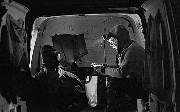 Un grupo de mariscadoras se refugian del frío en el inteior de su furgoneta antes de entrar al mar para marisquear.