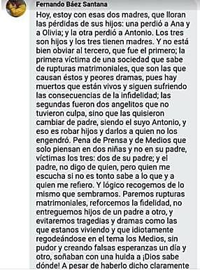 «Paremos rupturas matrimoniales, reforcemos la fidelidad, no entreguemos hijos de un padre a otro, y evitaremos tragedias», escribe el sacerdote. Y añade que el asesino «se quitó de en medio para no seguir sufriendo». En su habitual tono despectivo, Báez escribe que a ver si hay un psicólogo con «cojones» para corroborar lo que él afirma.