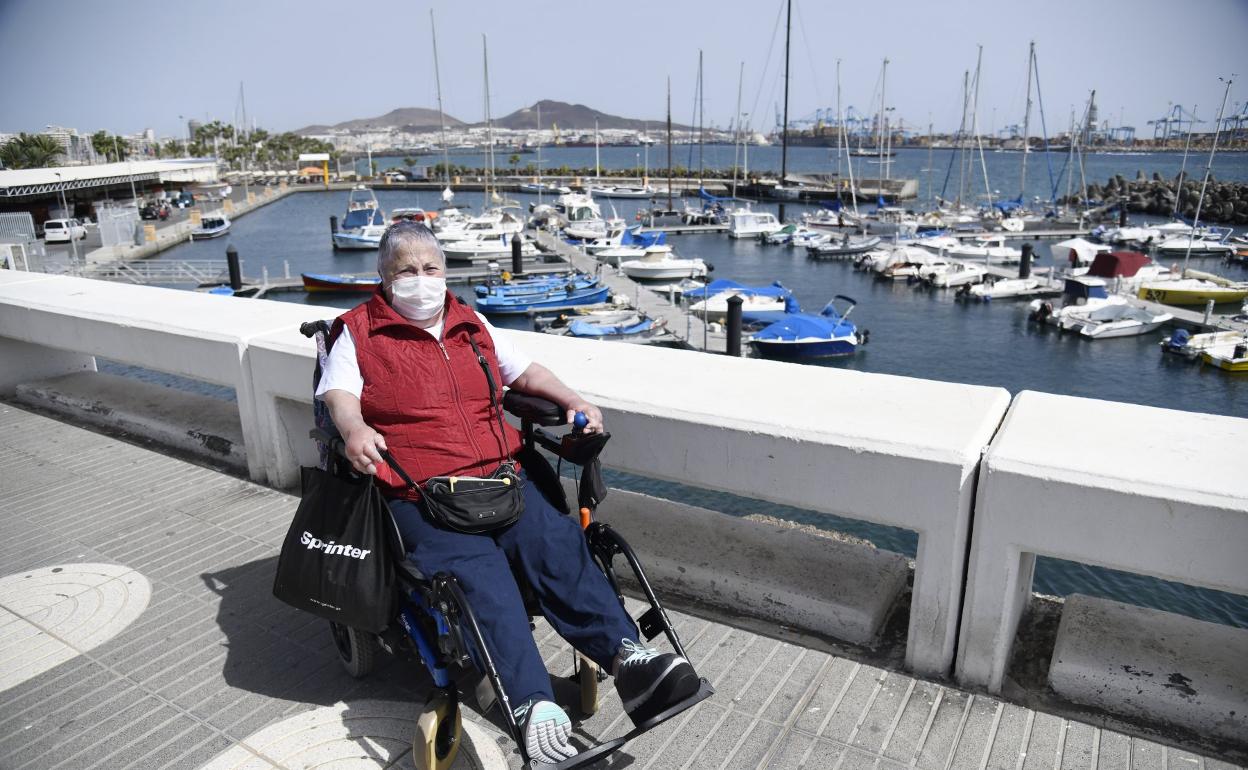 Este jueves Carmen Déniz por fin salió a dar su paseo y llegó al mar. En el trayecto ponía énfasis en los cambios en la ciudad en el último año. Las obras le impiden ir por la acera y debe circular por el carril bici. «Antes usaba una cámara y hacía fotos para llevarlas al ayuntamiento», explica. Las rampas para acceder a las aceras son en sí mismas barreras para las personas que se mueven en silla de ruedas.