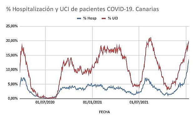 Aunque Canarias esté rozando, según su juicio, la cresta de esta sexta ola de contagios la presión asistencial está en niveles altos y continuará así, al menos, lo que resta del presente mes. «El retardo entre la serie de casos y la de hospitalizaciones hace previsible un crecimiento en hospitalización y UCI durante las próximas semanas. Esperamos llegar al pico a finales de enero», subraya.