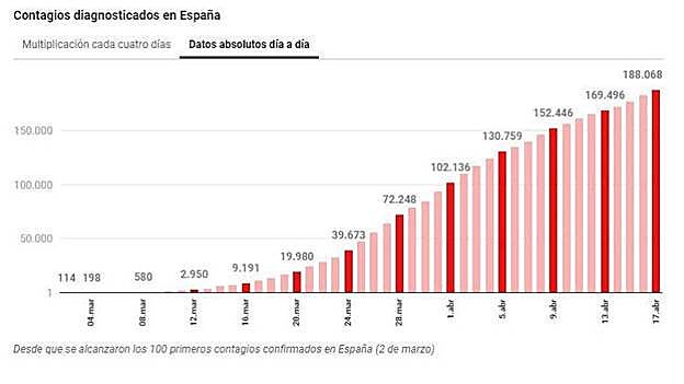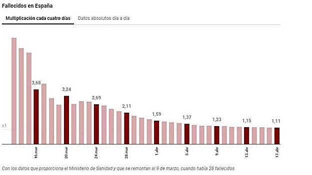 En España se cumplieron el domingo las primeras cuatro semanas de confinamiento y a viernes 17 de abril hay 188.068 contagios diagnosticados, frente a los 169.496 del 13 de abril (188.068/169.496 es igual a 1,11). Tomando como referencia el día en el que se superaron los 100 contagiados diagnosticados, el 2 de marzo, se observa un aumento en el periodo del 9 al 12 de marzo (con respecto al periodo del 5 al 8) hasta multiplicarse los casos por 5. No obstante, desde el 12 de marzo, tres días antes del confinamiento, el ratio ha mostrado una tendencia descendente hasta entrar en el periodo actual.
