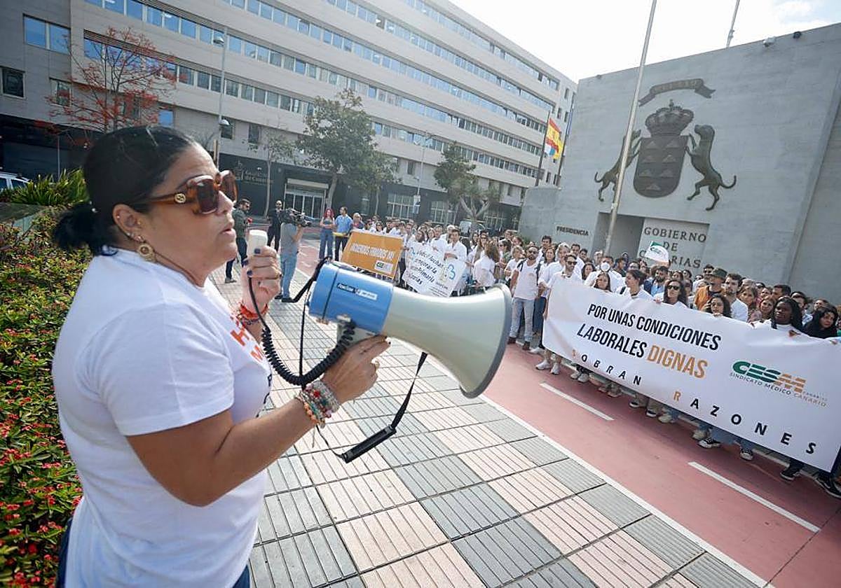 Unas 300 personas se reunieron a las puertas de la sede de Presidencia del Gobierno de Canarias, en la capital grancanaria, para levantar su voz y exigir unas mejores condiciones laborales y retributivas para los médicos.