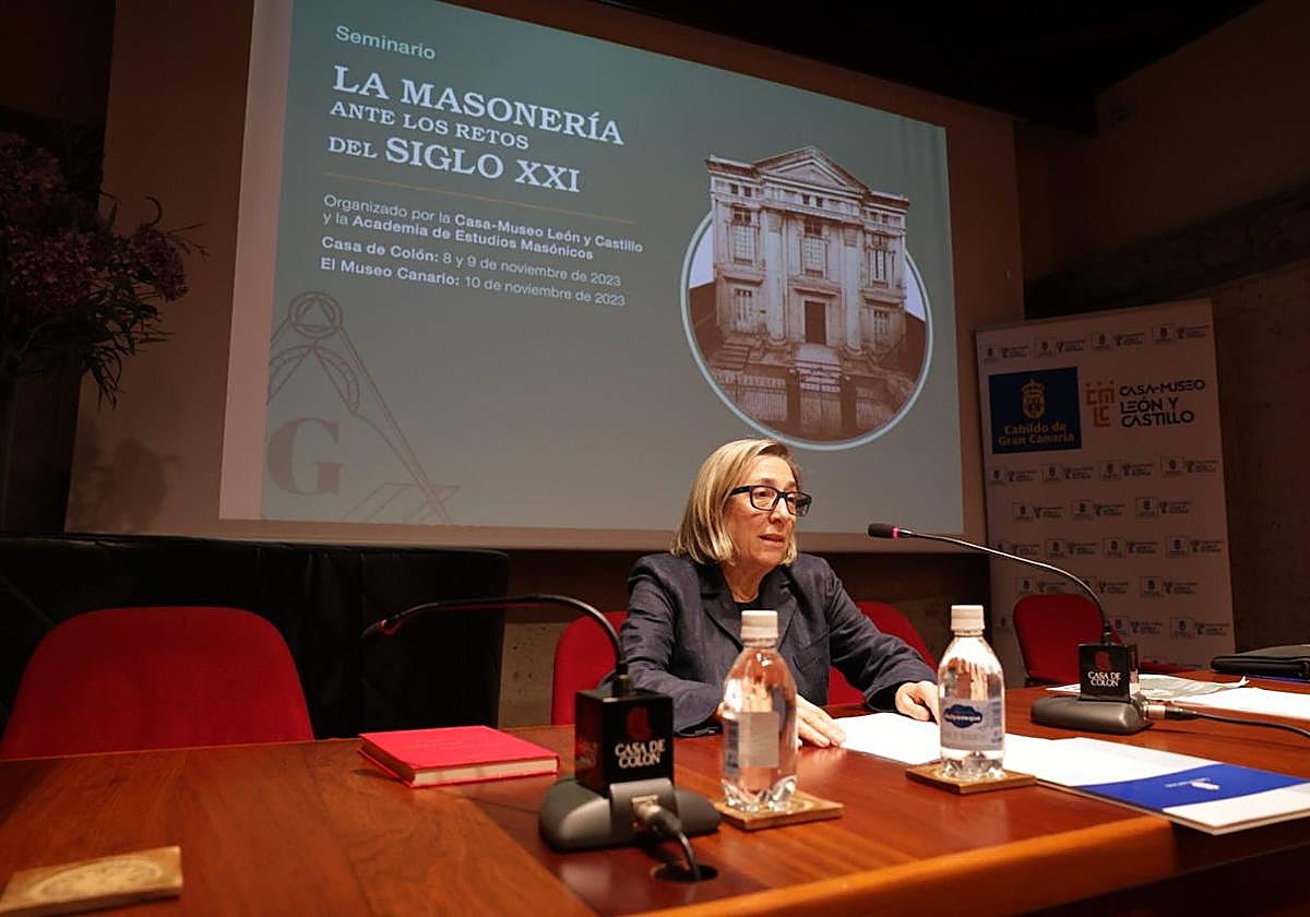 Mar Sánchez Bergua, gran maestra de la Gran Logia Femenina de España, abrió este miércoles el seminario 'La masonería ante los retos del siglo XXI', organizado por la Casa Museo León y Castillo y la Academia de Estudios Masónicos del Supremo Consejo del grado 33º y último del Rito Escocés Antiguo y Aceptado para España, que se celebra en dos sedes, la Casa de Colón y El Museo Canario, hasta el viernes.
