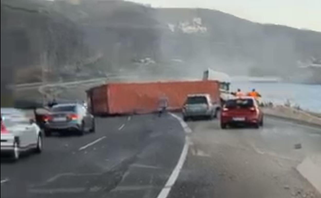 Aparatoso accidente a la entrada de la capital grancanaria en la tarde de este martes. Un camión contenedor de unos 12 metros de largo perdió el control en la GC-1, y quedó atravesado en la carretera a la altura de la curva de La Laja.