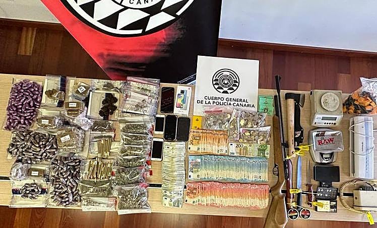 Además, también se incautaron de cuatro puñales, un hacha, una escopeta de aire comprimido, cinco móviles, cuatro básculas de precisión, una selladora, 6.000 bolsas transparentes y 200 envases de plástico, para el transporte de droga, y documentación que está siendo objeto de análisis.
