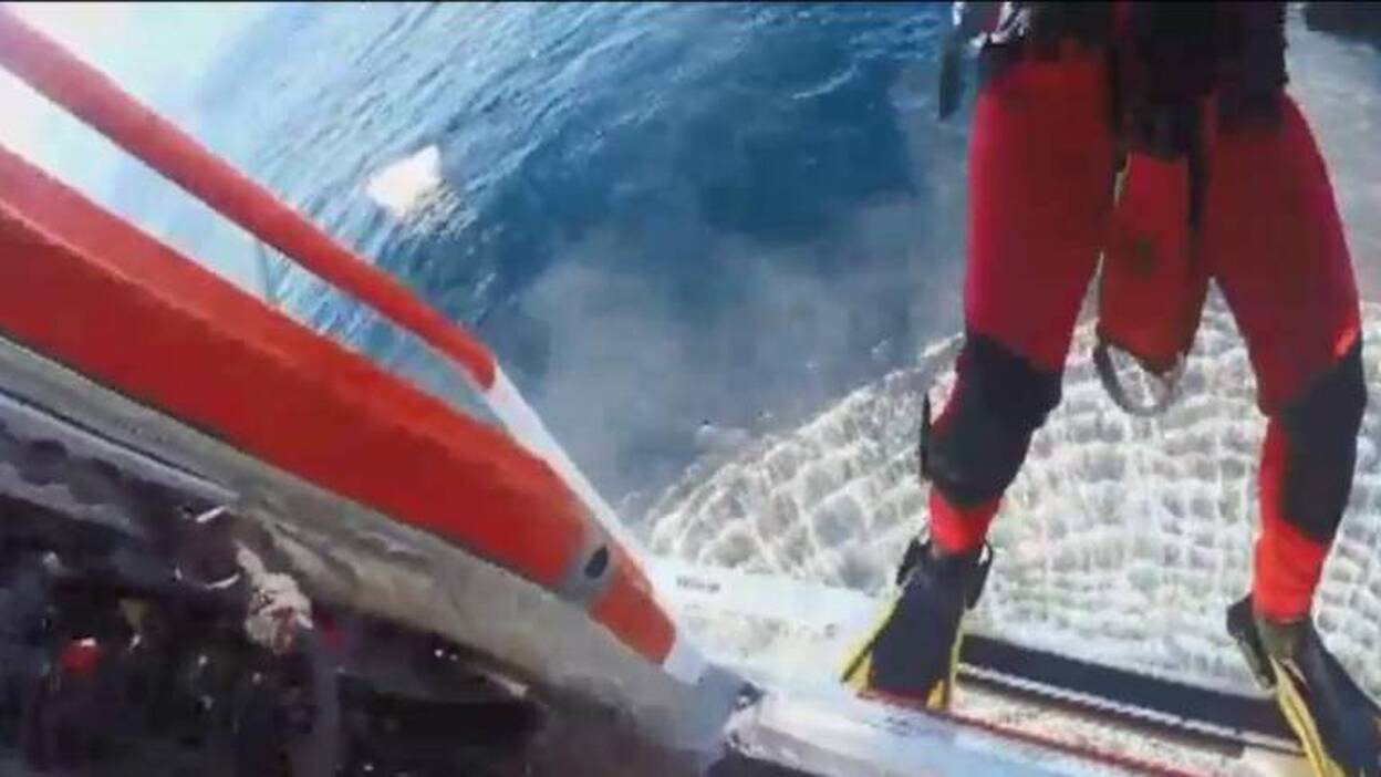 Salvamento Marítimo difunde las imágenes del rescate ayer de tres marineros del Trames Uno, caídos al mar tras colisionar con el catamarán Alborán de Naviera Armas. El buque Miguel de Cervantes traslada los restos de la pontona al puerto.
