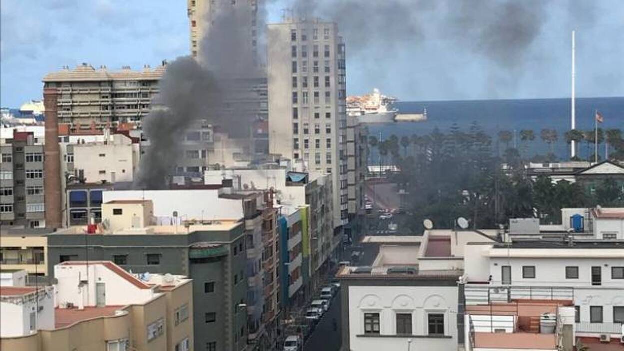Bomberos de Las Palmas de Gran Canaria actúan en la tarde de este martes en el incendio declarado en una vivienda de un bloque de cinco plantas con varias viviendas ubicado en la calle Plaza de la Feria, cerca de la Delegación del Gobierno en Canarias. El bloque ha sido desalojado.