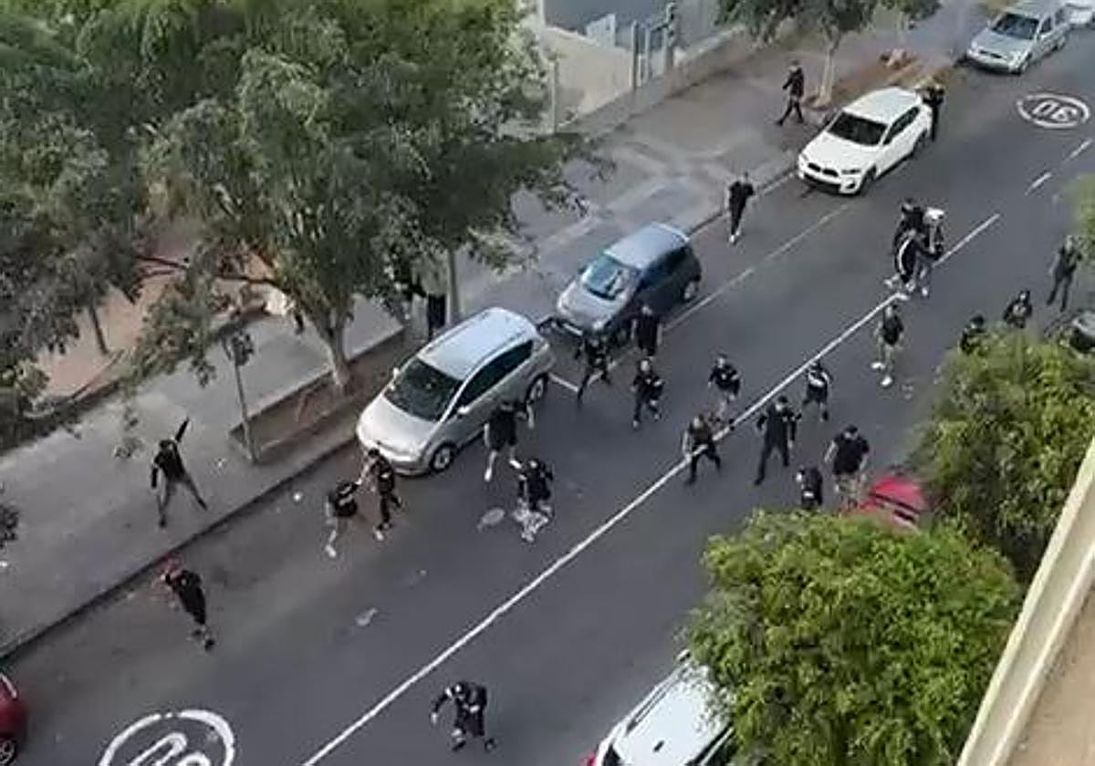 El incidente se produjo en la calle Fondos de Segura, a la altura del supermercado Hiperdino, donde un numeroso grupo de encapuchados vestidos de negro protagonizaron una violenta confrontación. Como resultado, se registraron cristales rotos en la vía pública y un notable revuelo entre los vecinos, que se mostraban desconcertados ante lo ocurrido.