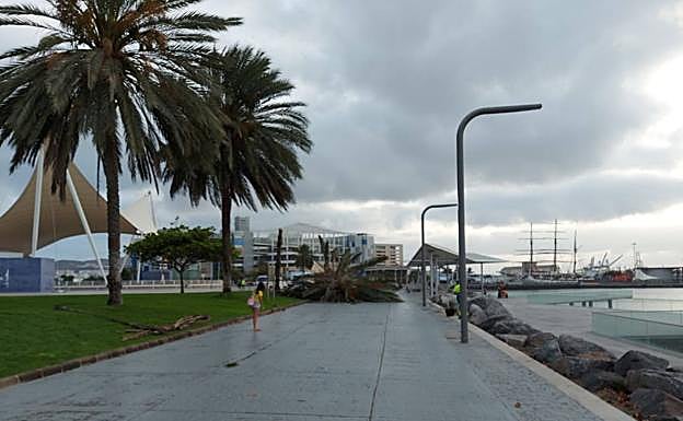 Una joven pasó unos segundo antes de que el viento tirase el cogollo. Hace una semana también se desplomó otra palmera en la zona por el viento