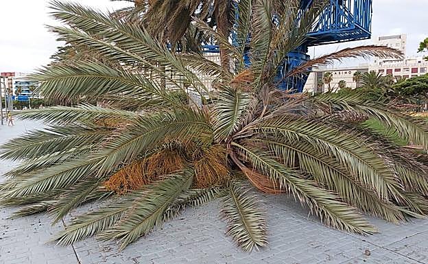Tremendo susto para varios viandantes al caer por el viento el cogollo de una palmera en la zona del intercambiador de Santa Catalina, cerca del centro comercial El Muelle, en la capital grancanaria. Aunque no hay heridos, una joven pasaba a la altura del árbol poco antes de que el cogollo cayese al suelo por los efectos del fuerte aire en la zona.