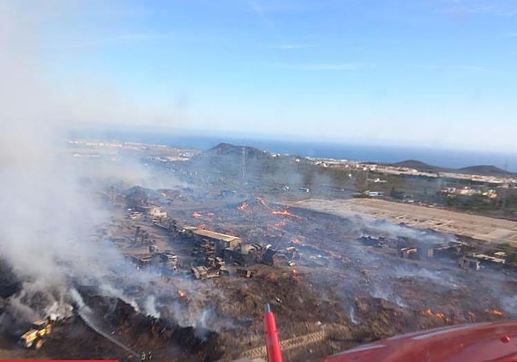 Dos helicópteros del Grupo de Emergencias y Salvamento (GES) del Gobierno de Canarias han intervenido, desde la tarde del pasado jueves, en el dispositivo de extinción del incendio declarado en una planta de compostaje ubicada en la zona de Parque La Reina, en el municipio de Arona, en el que han descargado 182.400 litros de agua hasta el ocaso del domingo.